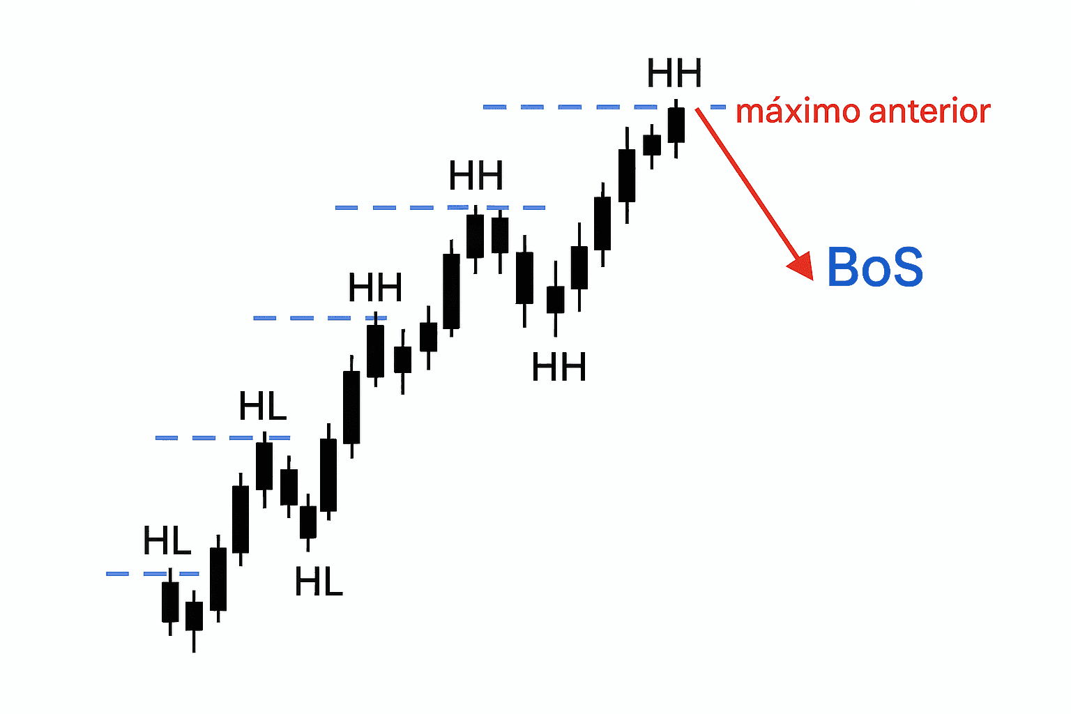 - Si el precio supera el último máximo anterior (HH), rompe la estructura.