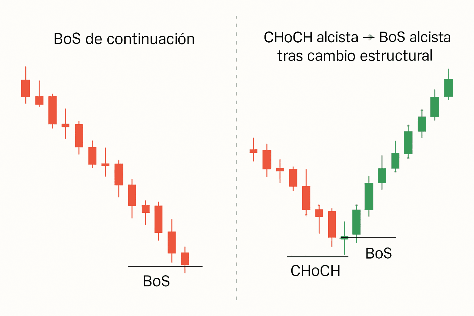 Derecha: CHoCH alcista → luego BoS alcista tras cambio estructural.