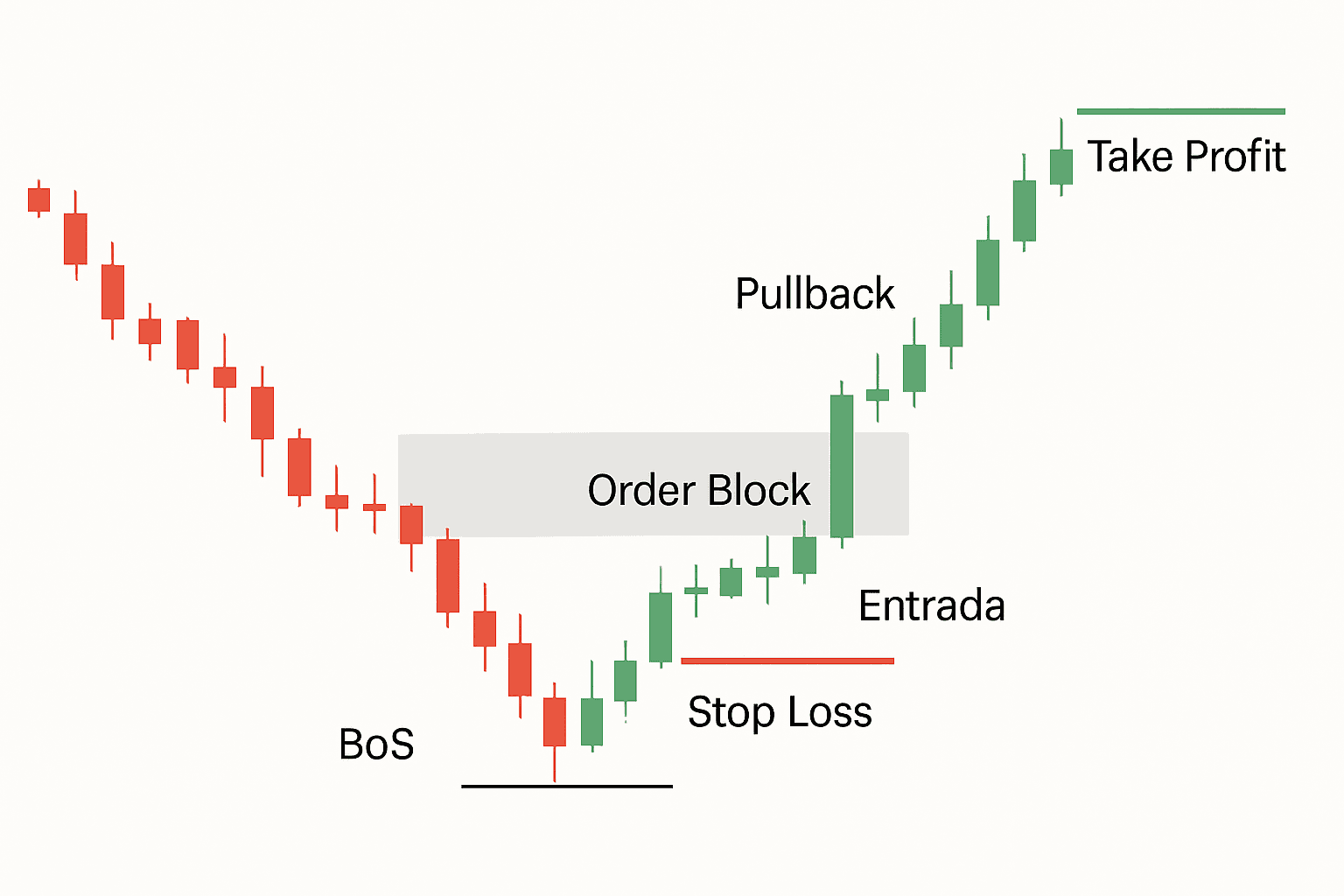 Después de un BoS, es común que el precio retroceda antes de seguir. Ese retroceso es tu oportunidad. Ahí es donde podés buscar una entrada, por ejemplo:
