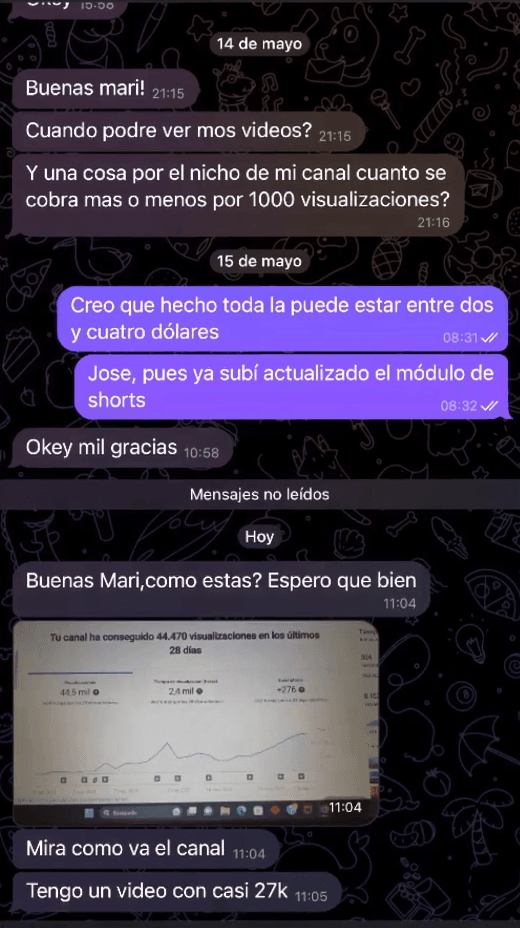 En este bloque veremos las experiencias de algunos alumnos del curso Monetizatube. A través de imágenes de chats y testimonios, podrás conocer lo que realmente están logrando con el curso de Mari Fuentes. No solo se trata de números, sino de historias reales de esfuerzo, resultados y el impacto que tiene el acompañamiento de Mari a lo largo del proceso de aprendizaje.