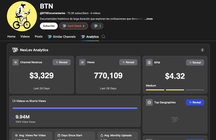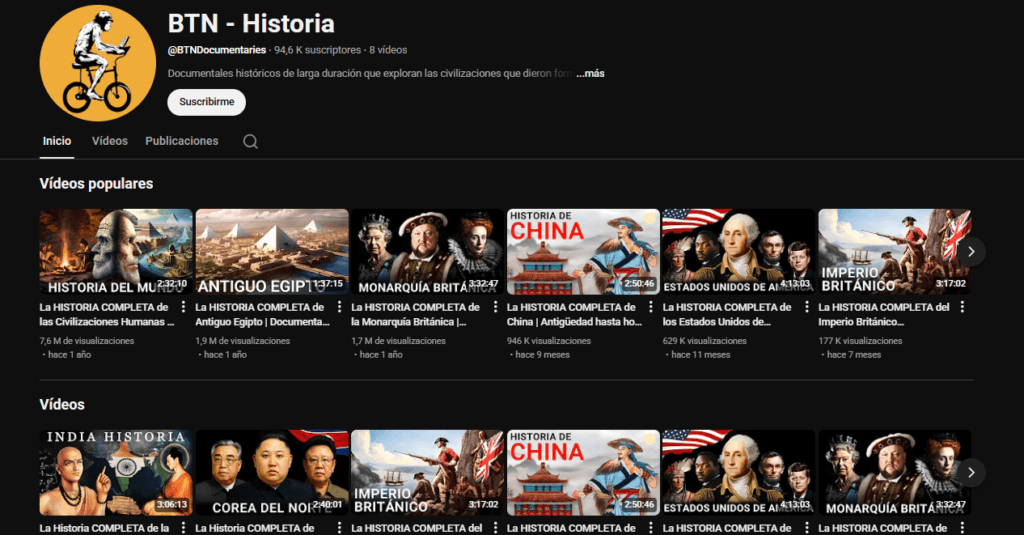 BTN trabaja con documentales largos, imágenes de archivo y narración en off. Es un formato más elaborado, pero igualmente automatizable mediante equipo, guiones y edición delegada.