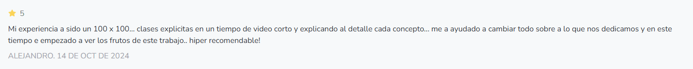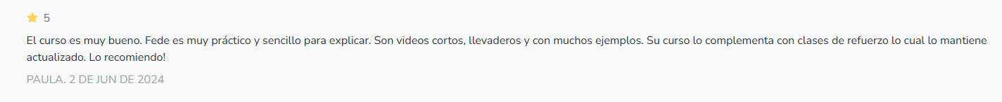 Además, el curso tiene muy buenas valoraciones y opiniones en general, lo cual no es poca cosa. Sumale las clases en vivo, el acompañamiento y la comunidad, y el curso termina siendo más completo de lo que parece a simple vista.