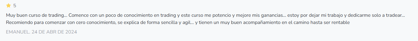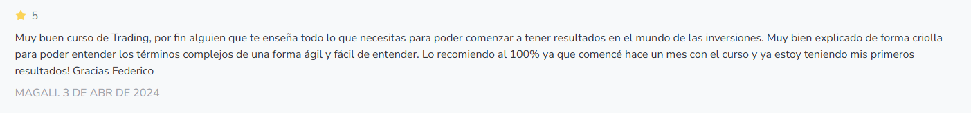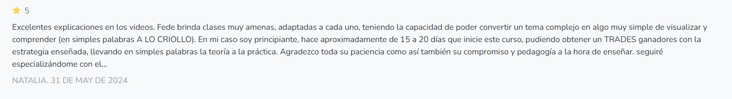 Una de las cosas que más sorprende al investigar sobre Trading Criollo es la excelente valoración que tiene por parte de quienes ya lo compraron. En Hotmart, el curso cuenta con una calificación perfecta (5 estrellas en todas las reseñas), algo poco común y que habla muy bien tanto del contenido como de la forma en la que está explicado. Al parecer, la propuesta clara y sin vueltas de Federico realmente conecta con los alumnos.